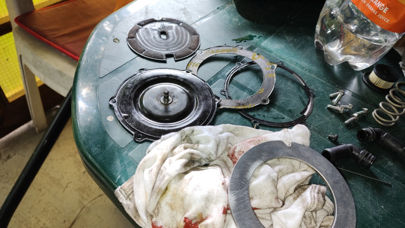 Tedy nejdřív demontáž z vozu. Odpojení hadic s vodou (chladící kapalinou) odpojení plynu kapalné části a plynové části. Samotný reduktor byl sám o sobě dost zašlý. Rozhodl jsem, jej zcela vyčistit a ve vnitř vše vyměnit. Po jeho rozebrání jsem zjistil hlavní závadu. Špatná těsnění a malá dírka v membráně. Tudíš teplá voda se dostala do plynné části, což degradovalo výkon a jednotka se přepla do nouzového režimu. Vypla chod motoru na LPG. 11 let nebylo revidováno a nebo blbě revidováno. Na všechno aby člověk dohlížel sám. V žádném servisu nikdy nic neudělají správně. Spíš vůbec. Ale inkasovat to jo. Takže do servisu toto auto již nikdy nepůjde. Revize si od nynějška dělám zásadně sám.
