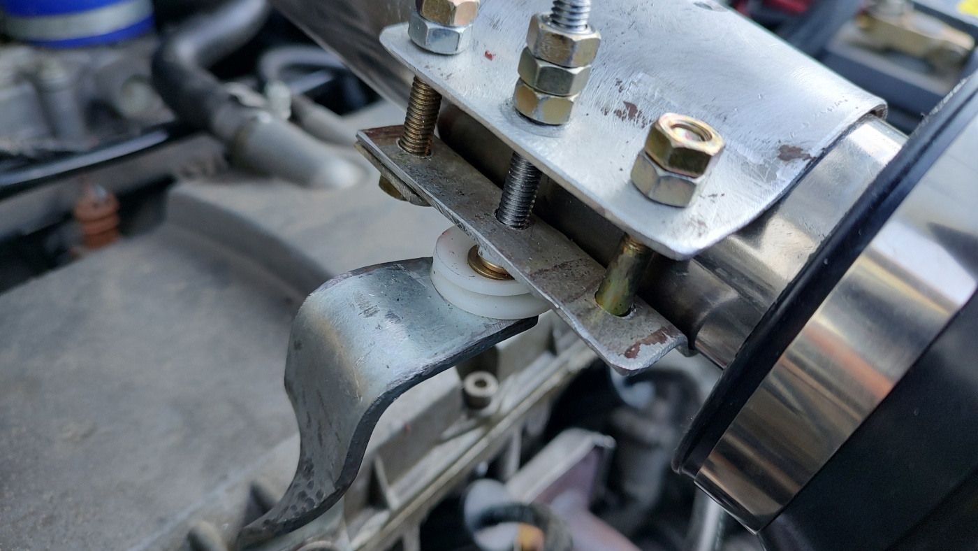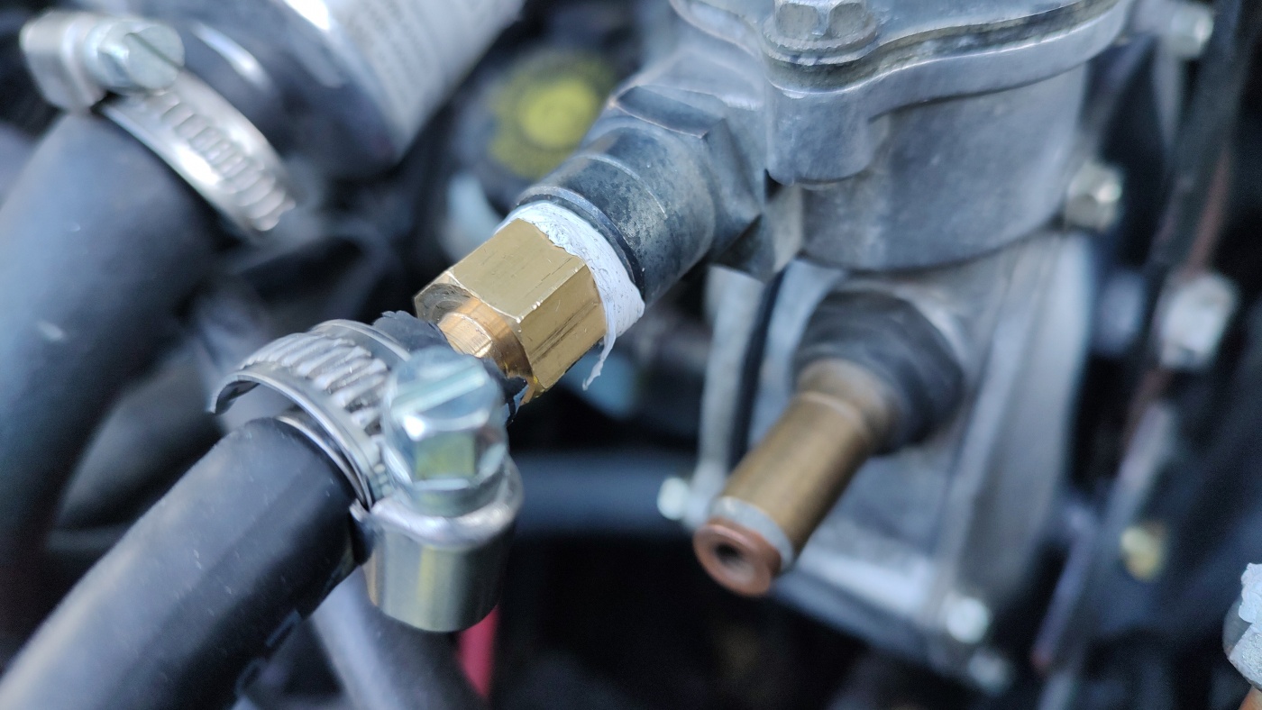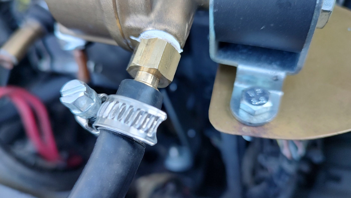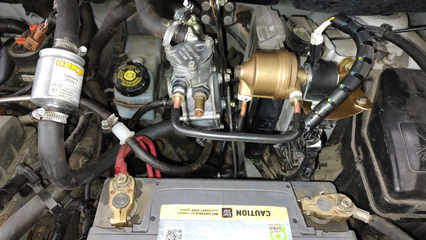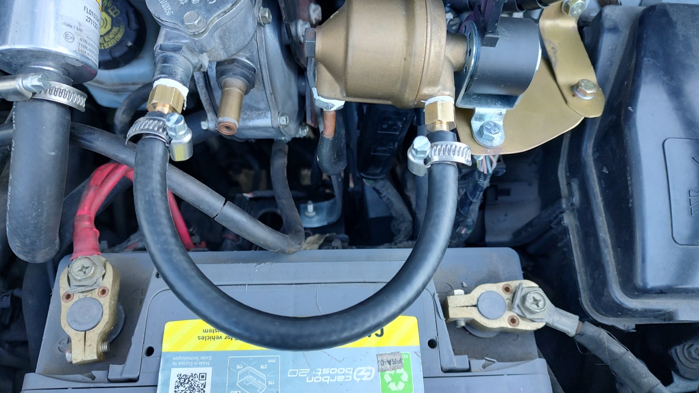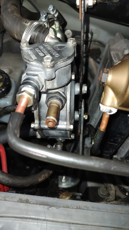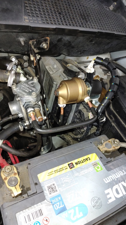 Reduktor jsem Zrepasoval, všude dal nová tesnění, membránu i klapku za membránou. Pak byl čas vymyslet nový držák. Původní držák už jsme upravovali před 4. lety, ale nebylo to ještě ono. Bylo potřeba držák uchytit alespoň na dva body. První bod jsem uchytil na krycí plech motorku stěračů. Stačilo jen vyvrtat díru a uchytit na šroub. Druhý bod k uchycení držáku je hned za baterii. Tam už byl od minula připravený šroub. Tím jsme docílili pevného uchycení držáku reduktoru. K němu se tak může ze všech stran velmi pohodlně. Nic nikde nepřekáží a jeho montáž je tak velmi snadná. Jelikož by reduktor celkově posunut výše, než před tím, nebylo třeba prodlužovat vodní hadice. Vše jsem zapojil a zbývala jen poslední věc a tou byla nová trubička z el. ventilu s filtrem do reduktoru. Pro nedostatek dílů jsem použil měděnou trubičku s koncovkami a mosaznými čočkami na konci. Moc se mi toto řešení nezamlouvalo a později jsem tuto celou spojku vyměnil za hadičku se sponami. To bylo elegantnější a lépe těsnící řešení. Pertlovaná trubička nebyla příliš těsná.