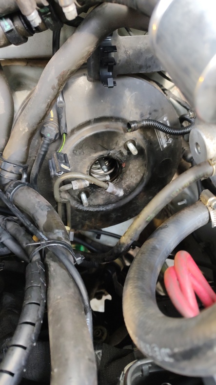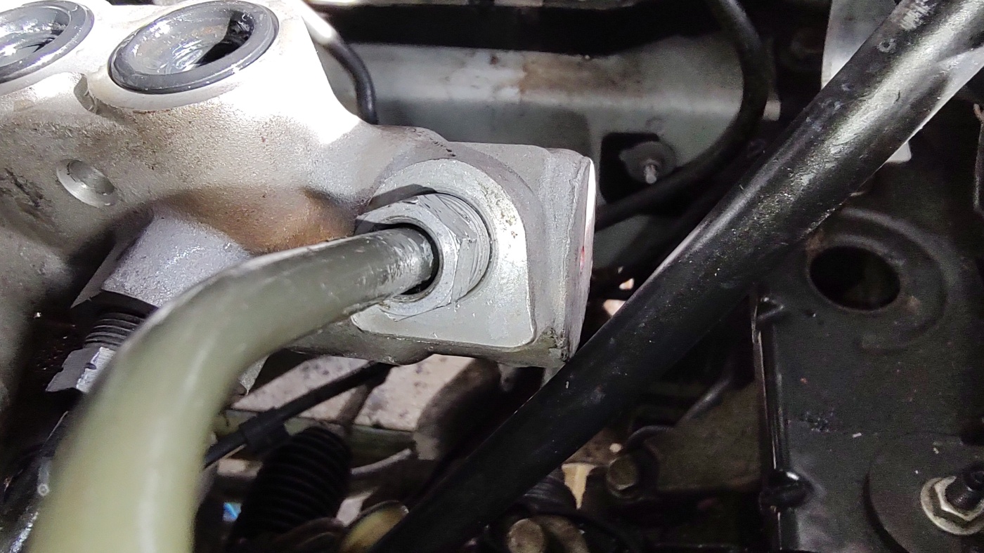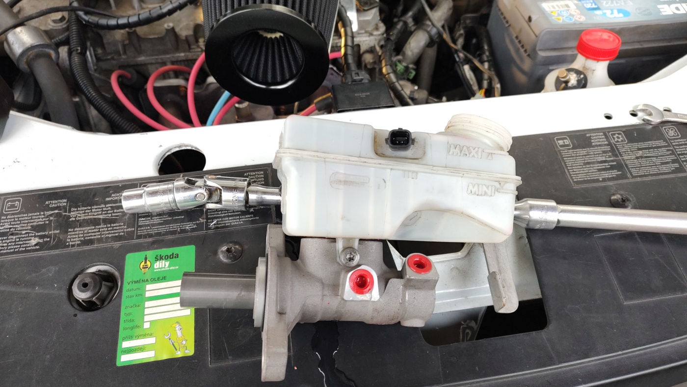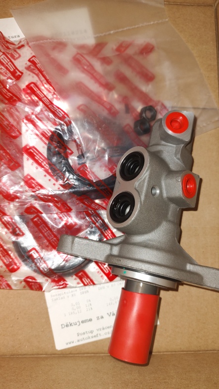 Další část byl hlavní brzdový válec. V něm byla ta chyba propadání se pedálu. Demontáž z vozu byla dost šílená. Kvůli LPG systému, není v motorovém prostoru dost místa na větší montáže. Pár věcí z motoru bylo třeba odstrojit, abych se vůbec dostal k brzdovému válci. Kravina jménem "nádobka brzdové kapaliny", je tak nešťastně umístěna, že jsem zase zuřil nad debilitou konstruktérů. Proč je umístěna přímo na válci? Skrz ní se nedá dostat na šrouby k povolení válce. Brzdové trubičky šly povolit naštěstí snadno. Ovšem už jsem viděl problém, až se bude montovat válec zpět. Každá trubička je vedena jinam. Proč nemohly být umístěny v jedné ose. Při zpětné montáži nepřidělávejte válec na šrouby dřív než chytíte obě brzdové trubičky. Dále je velmi důležité sundat plnící nádobku. Až chytíte závity k trubičkám v klidu usaďte válec na připevňovací šrouby. Jedině tak lze vše udělat bez problémů. Závit pro druhou trubičku je totiž úplně nesmyslně veden mírně nahoru. Chytit závit dobře zároveň s nádobkou je nemožné. I v nádobce je výřez aby se trubička vůbec dala zašroubovat. Nelze tedy válec zaplavit brzdovou kapalinou a připravit si ho na zpětnou montáž. To musíte bohužel udělat až na voze.