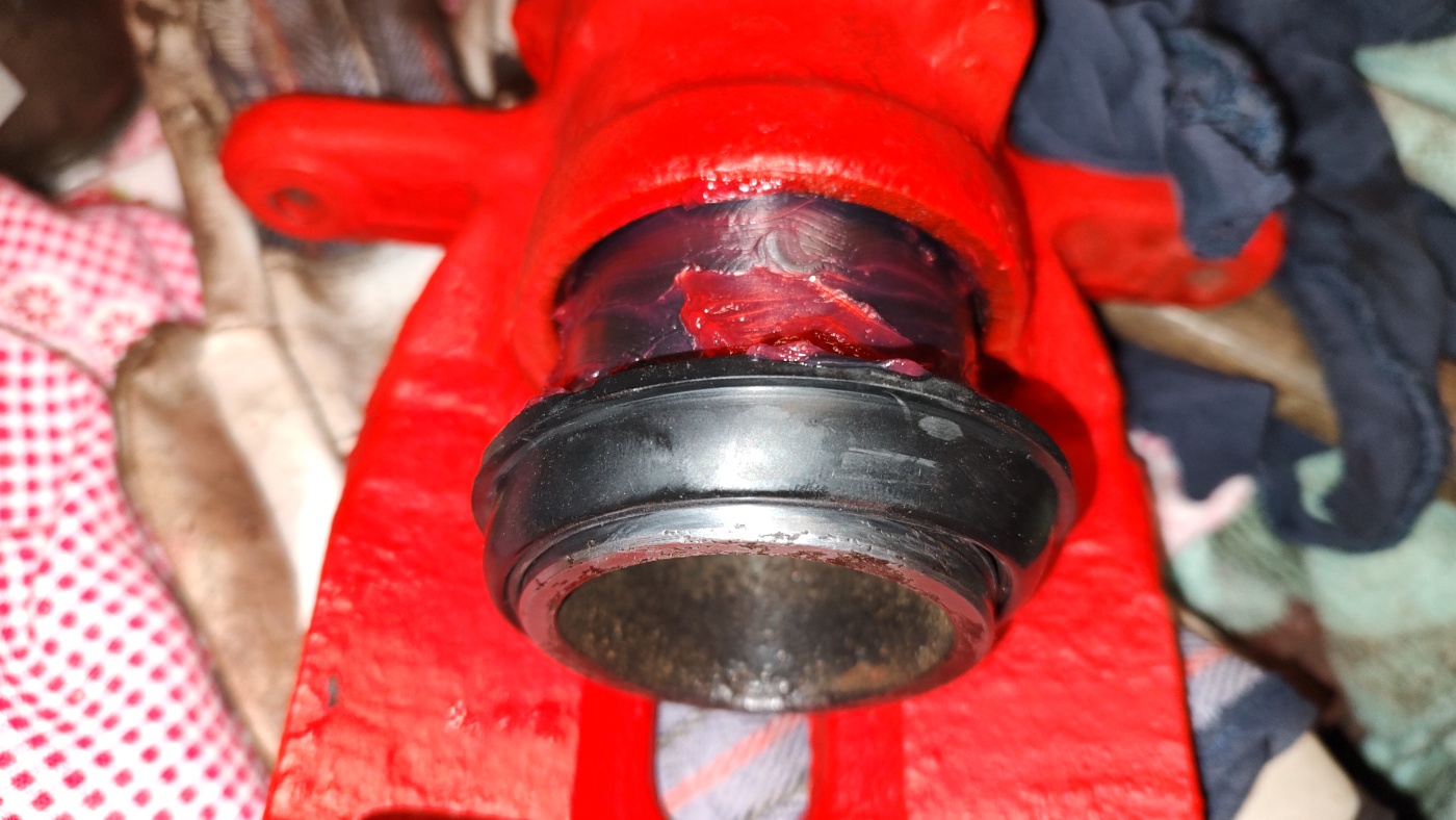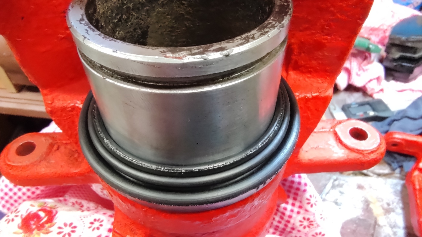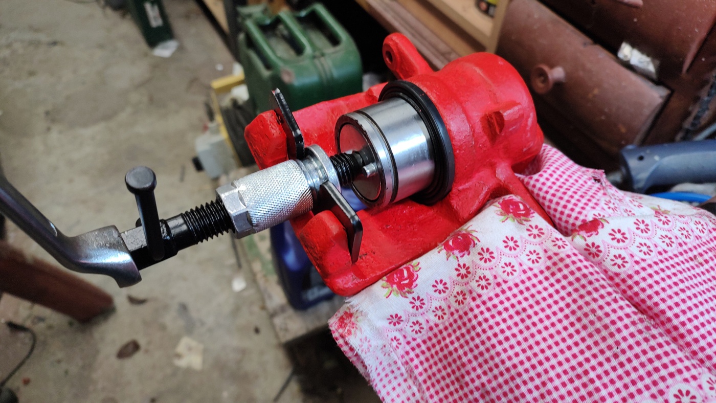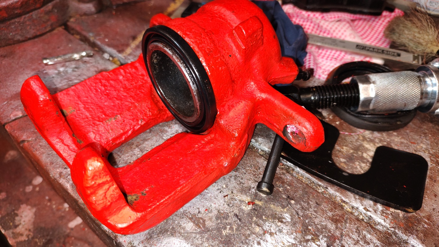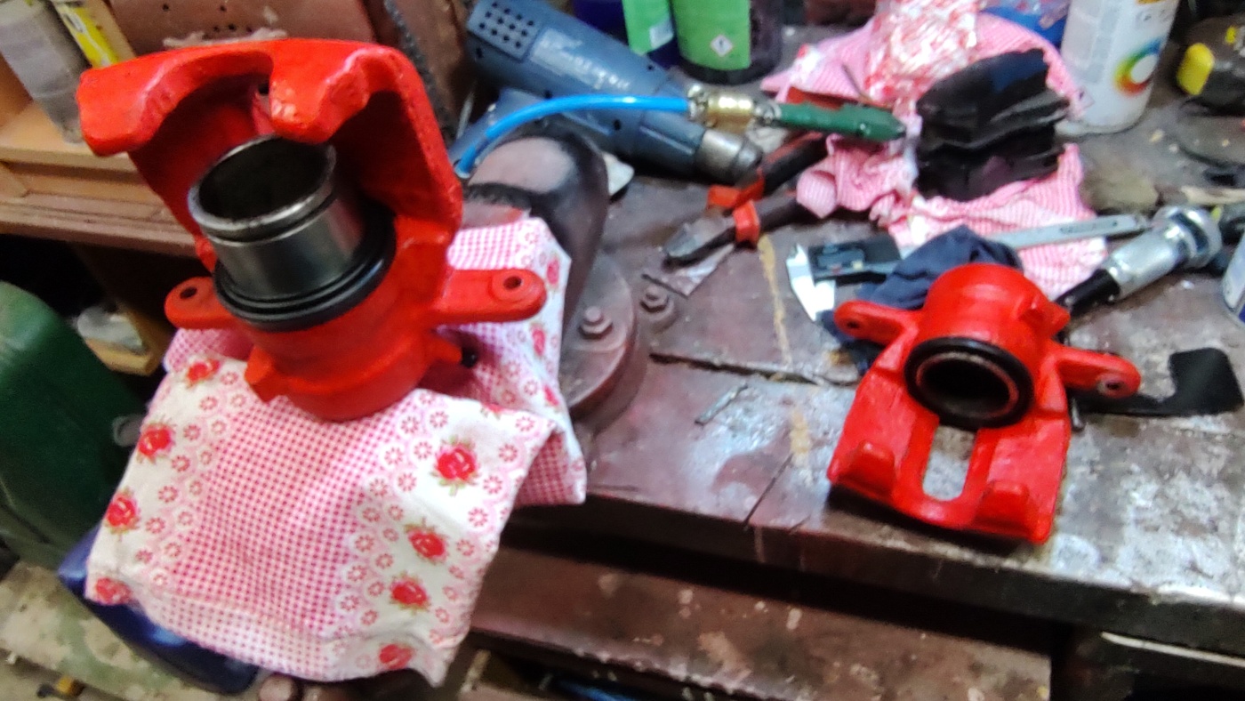 Začal jsem se třmeny na předních bzdách. Demontáž byla snadná neb já auto stále udržuju v kondici, všechny šrouby mažu a vždy jdou dobře povolit. Pak nastala práce v dílně. Tlakem vzduchu vyfouknete celý píst ven ze třmenu. Nenechte tam prsty jako já (blbec). Píst se mi zastavil o můj prst a bolest byla neskutečná. Písty jsem tentokrát nechal staré. Na pracovních plochách ještě nebyla rez. Jen zvenku, tam kde se píst dotýká destiček. Při příští generálce, za pár let, se vymění komplet celý třmen i s pístem. Práce šla celkem dobře. Jen nazout na píst tesnění a jeho jednu část nechat volnou, aby šla nasadit na třmen, byl trošku vopruz. Krom toho jsem pořídil jiné gumičky než měl můj typ vozu. Staré byly naštěstí neporušené a tak se měnily pouze vnitřní gumy.