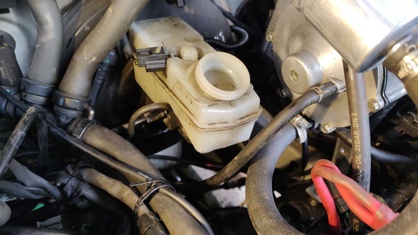 Pořád jsem měl pocit, když sešlápnu brzdový pedál, tak po zastavení chodu, se ještě malinko propadne. Né, že by auto nebrzdilo, ale brzda zkrátka nebyla tak tvrdá jako když bylo auto nové. Bylo tedy rozhodnuto vyměnit v brzdových třmenech všechny gumy a to samé v hlavním brzdovém válci + nové destičky. Zadní brzdy se měnily kompletně před cca 4, lety. Takže ty jsme nechali být. Gumičky do hlavního válce se mi nepodařilo sehnat, takže výměna celého válce byla jesná volba. Kromě toho válec jako celek není nikterak drahý. Brzdová kapalina už měla 11. let za sebou a byla dost kalná. Tu úplně odsajeme a dáme novou, čistou, zdravou.